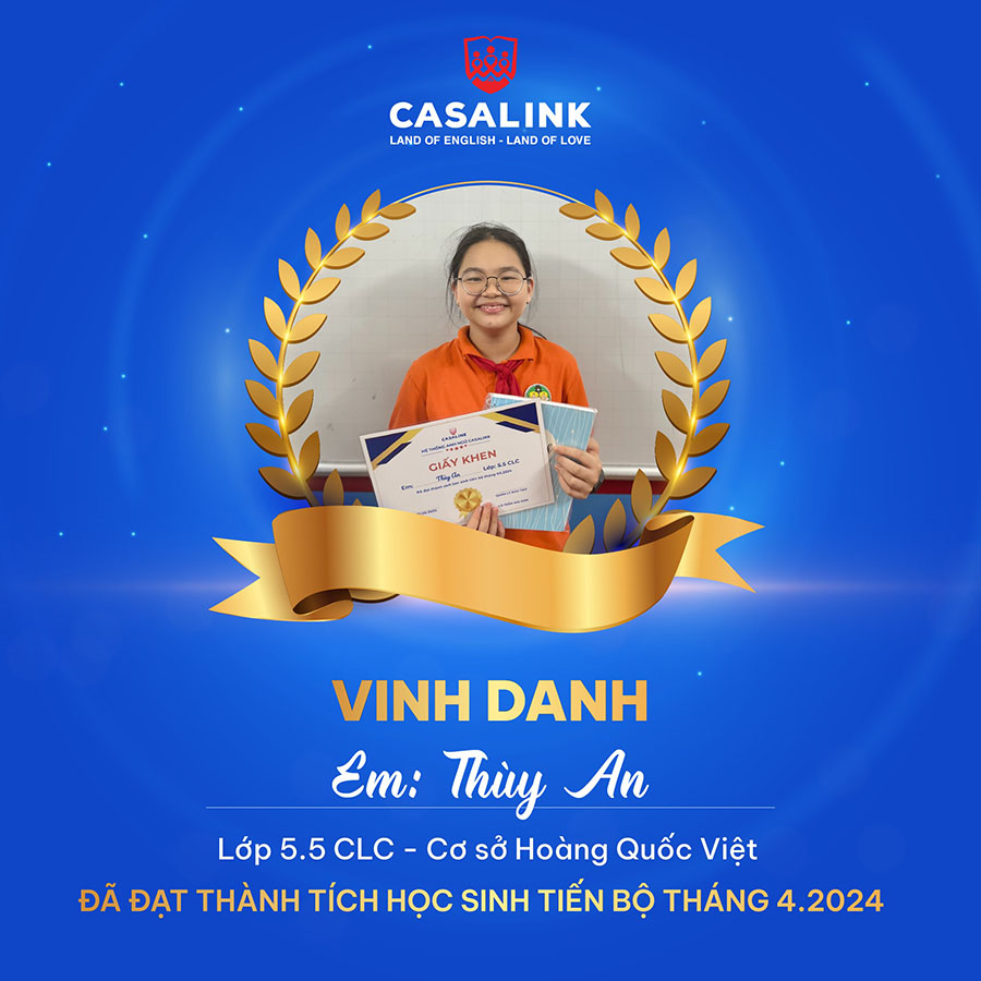 CASALINK xin gửi lời chúc mừng chân thành nhất đến tất cả các học sinh đã được vinh danh trong tháng này. Các em chính là niềm tự hào của gia đình, thầy cô và cả cộng đồng học sinh CASALINK. Với những gì đã đạt được, các em sẽ còn tiến xa hơn nữa trong tương lai. Mỗi bước tiến của các em hôm nay sẽ là nền tảng vững chắc cho những thành công rực rỡ sau này.