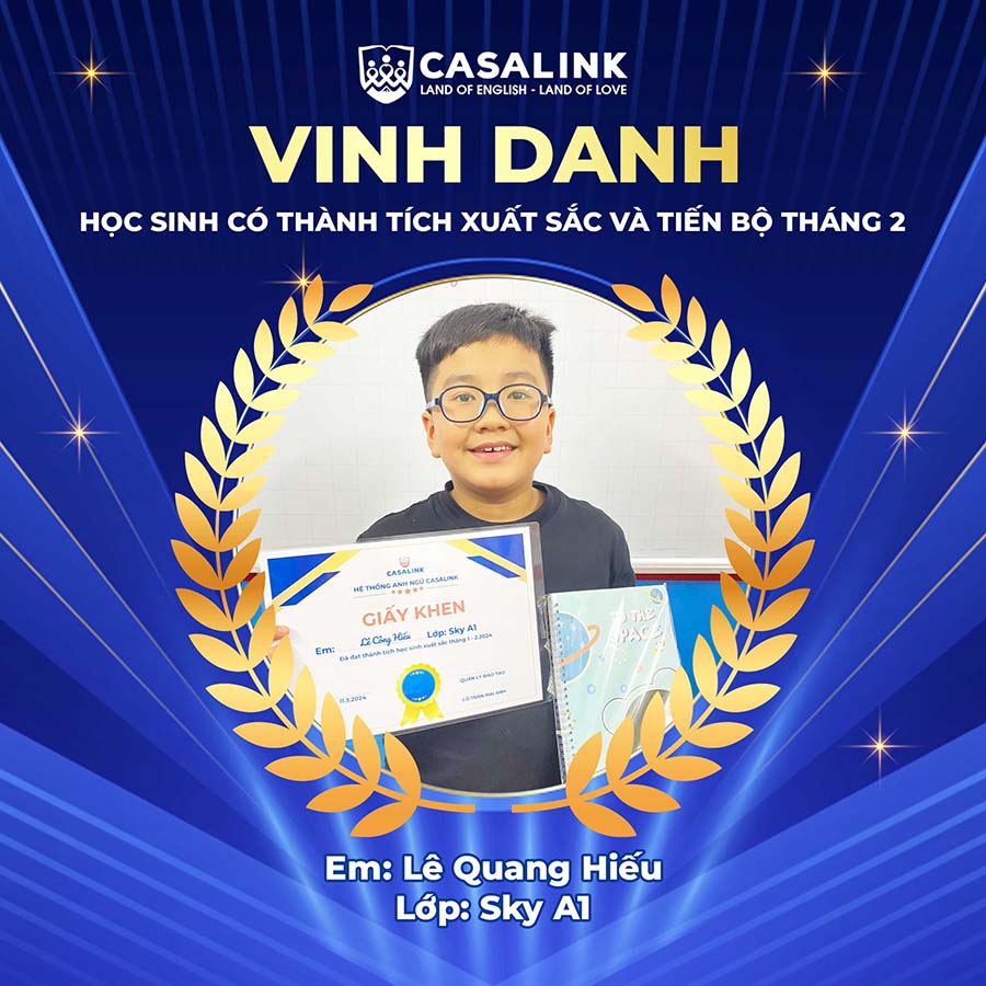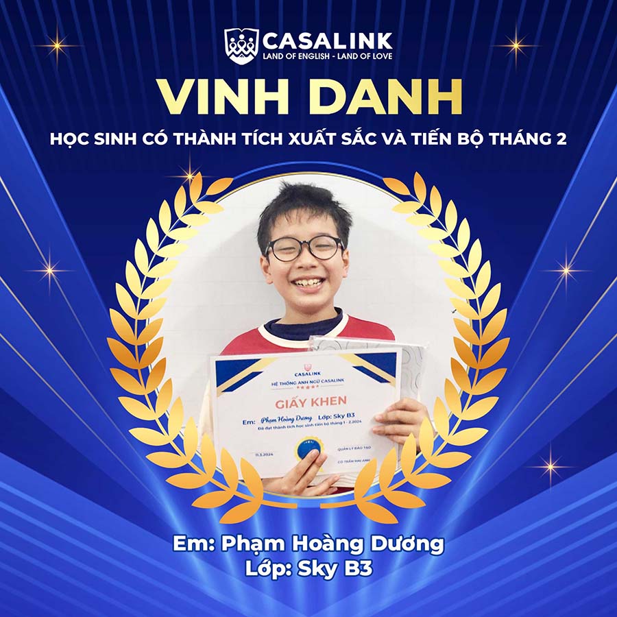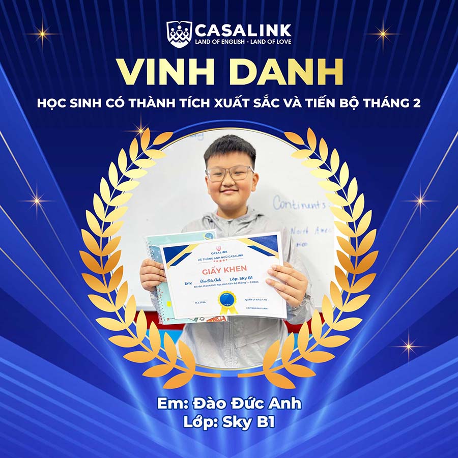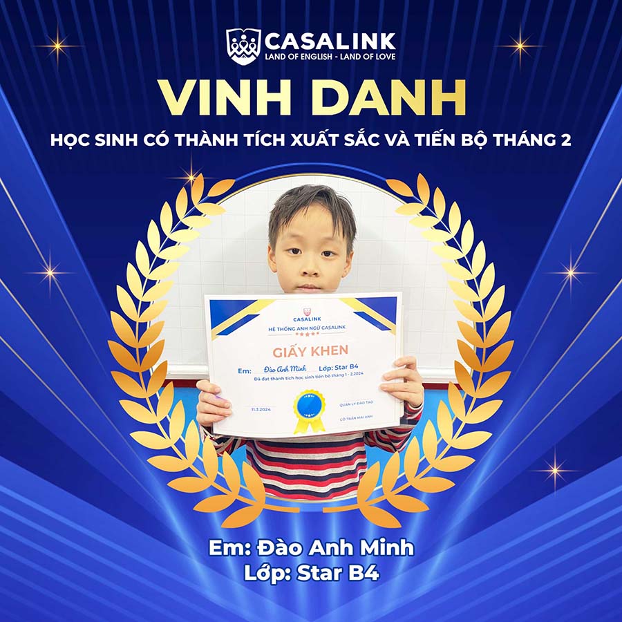 Thay mặt toàn thể đội ngũ giáo viên, CASALINK xin gửi lời chúc mừng chân thành đến tất cả các bạn học sinh đã có thành tích tốt trong tháng 2. Hy vọng rằng những thành tích này sẽ là động lực để các bạn tiếp tục phấn đấu trong tương lai.
